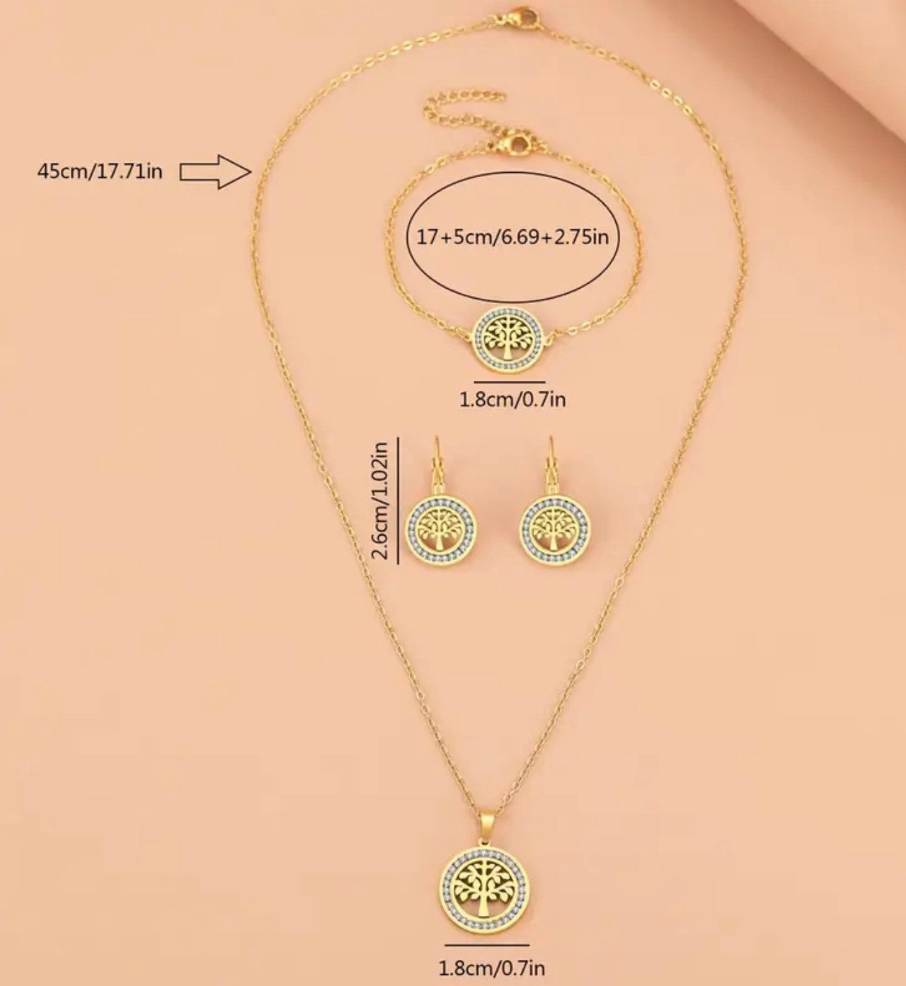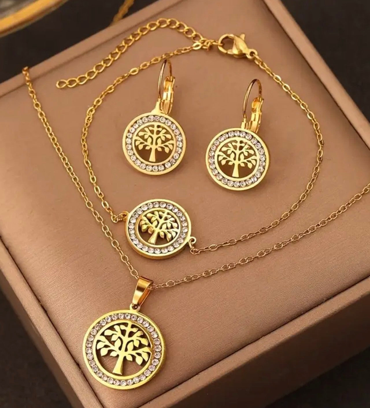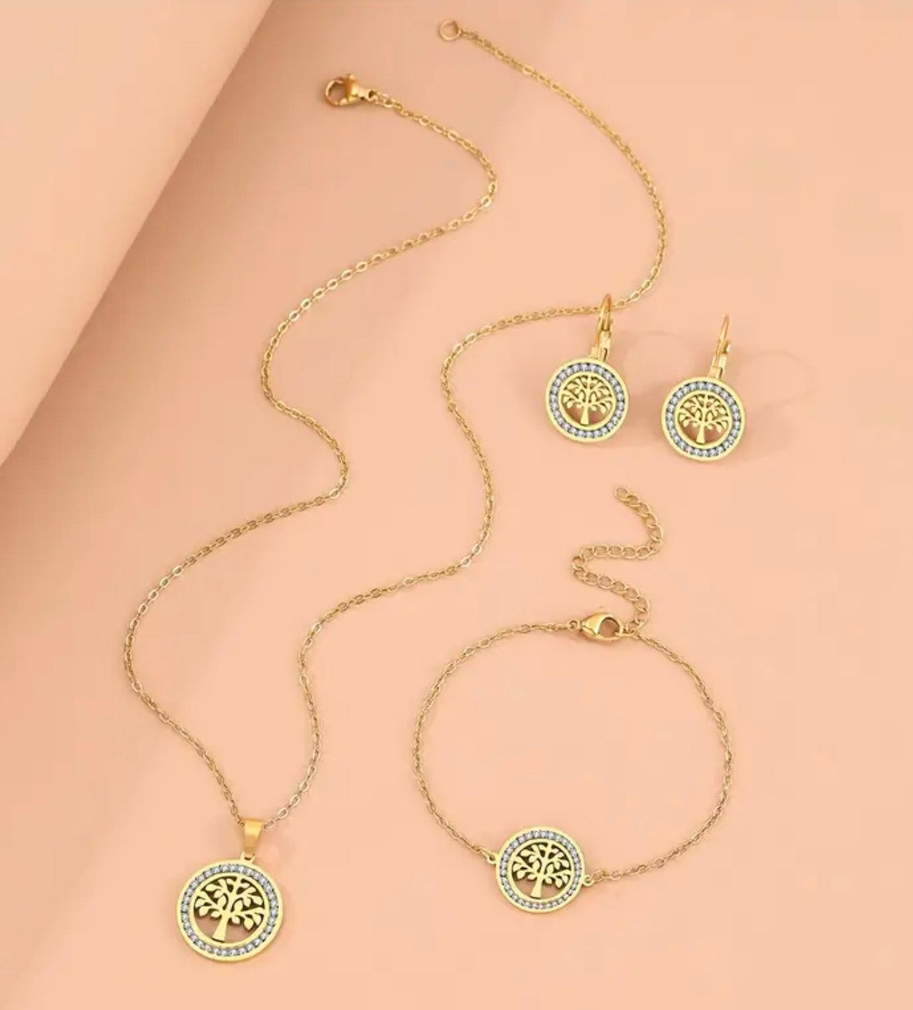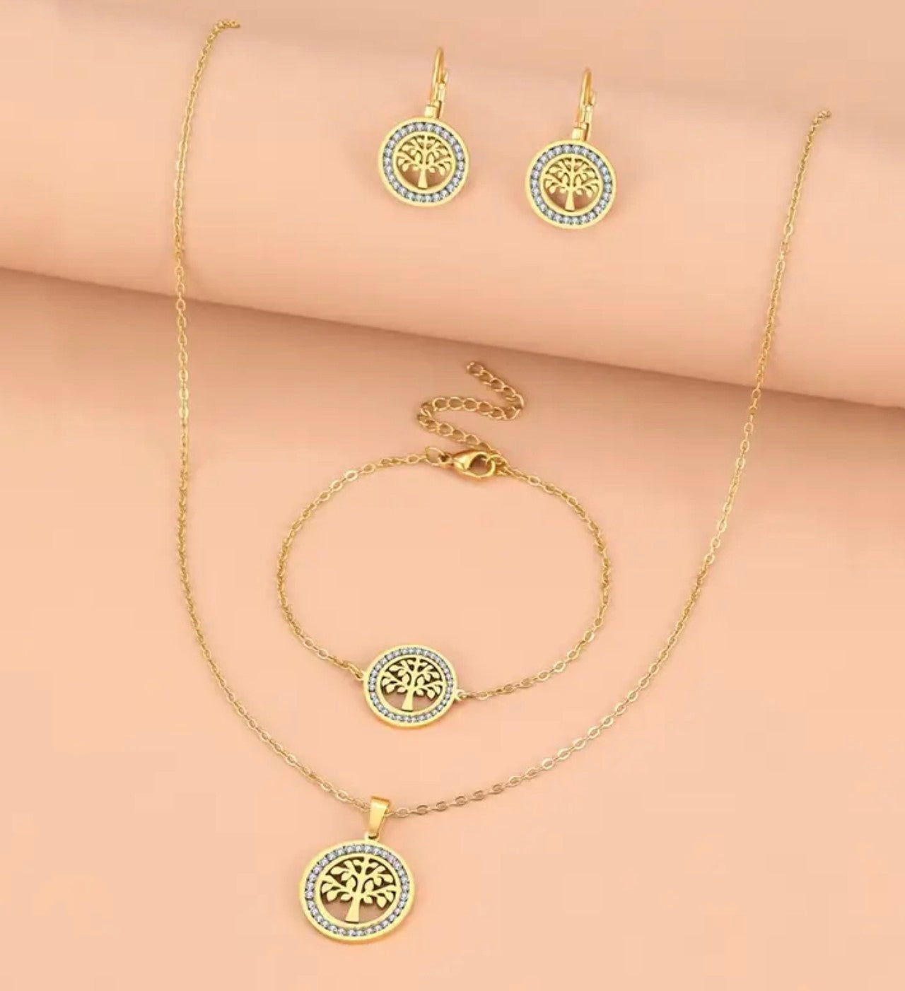 Златен дамски комплект дървото на жъвота. Колие гривна и обеци