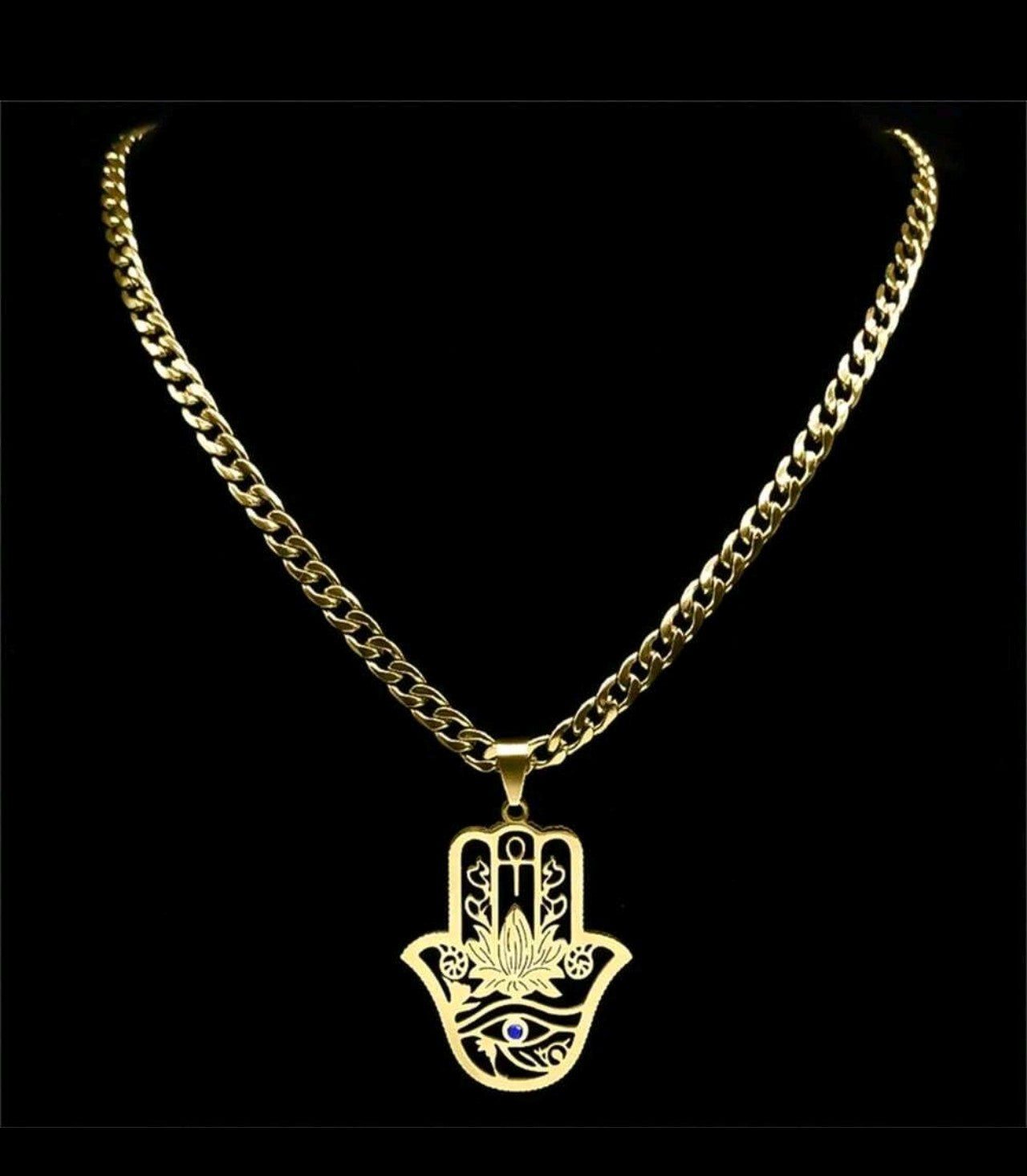 Златен ланец унисекс 60см с висулка ръчичка с око против уроки