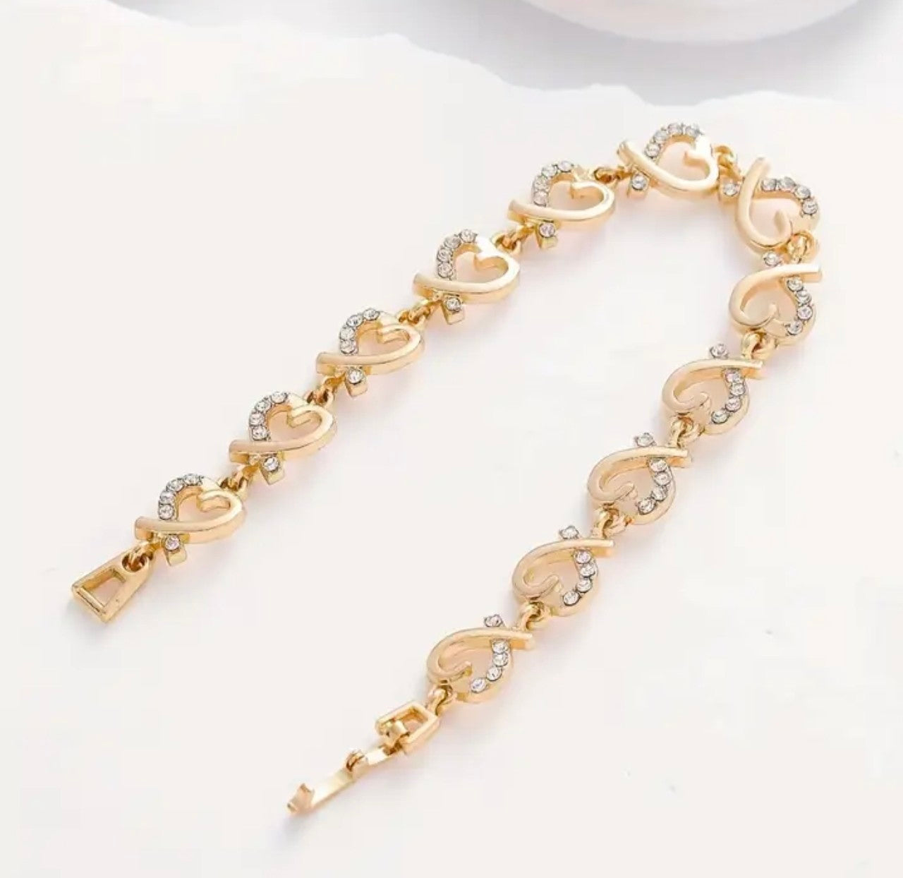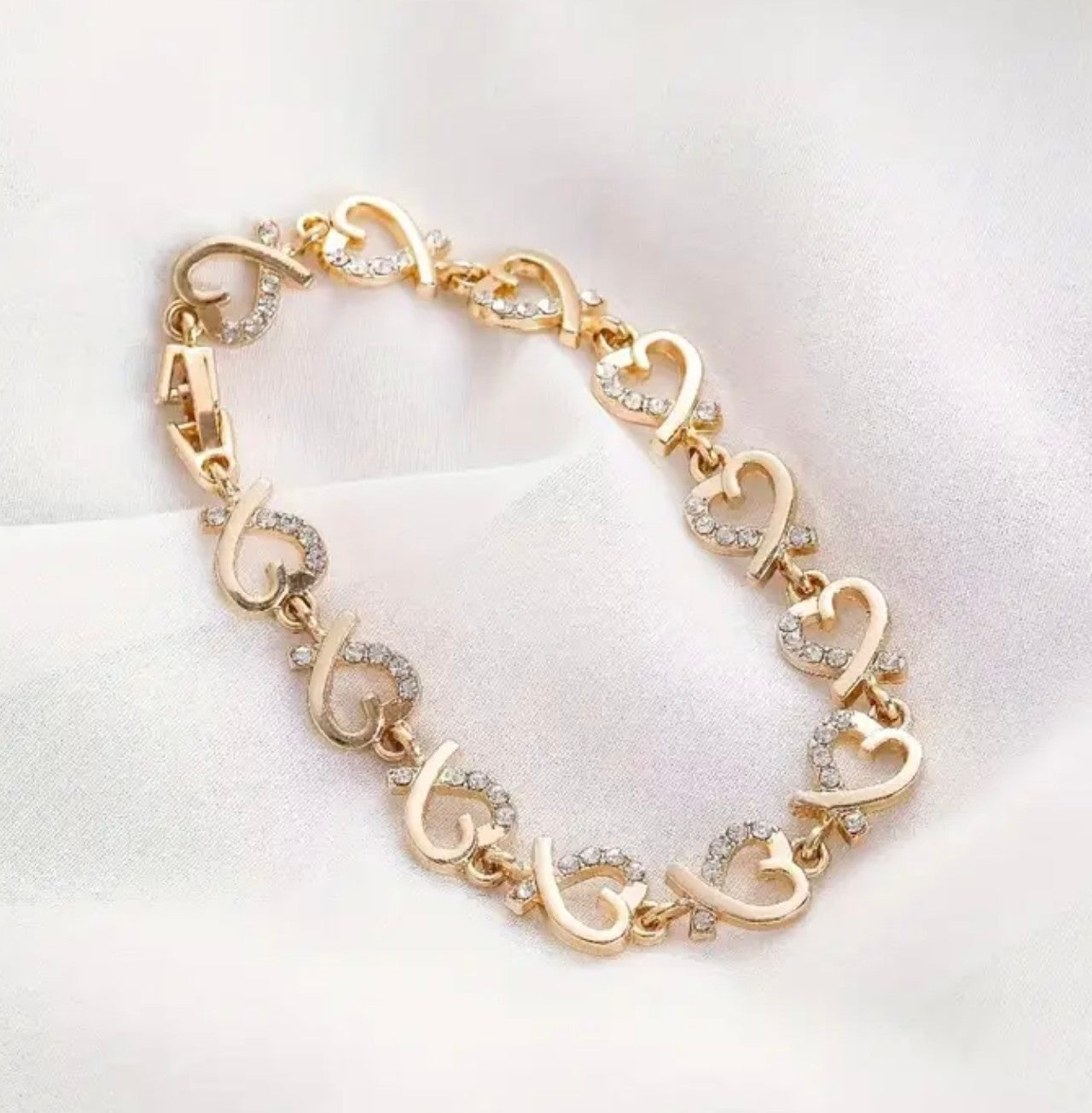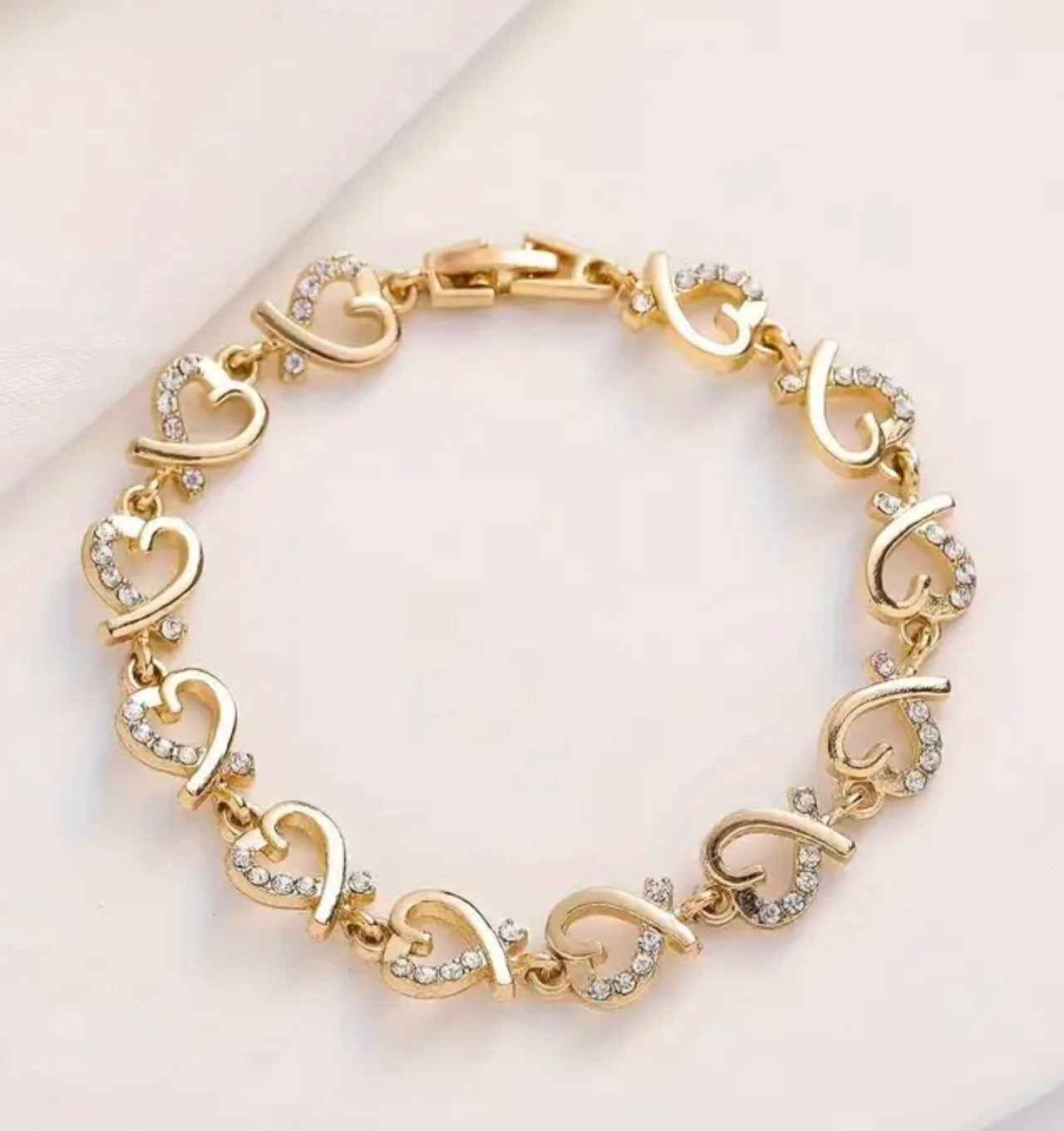 Гривна Златно сърце е елегантно бижу, изработено от висококачествено медицинско злато, което не променя цвета си и запазва блясъка си във времето. Нежните сърцевидни елементи, инкрустирани с фини кристали, придават романтичен и луксозен акцент, подходящ както за ежедневието, така и за специални поводи. Тази гривна е стилна и достъпна алтернатива на скъпото злато, носеща усещане за красота и изящество на всяка дама.