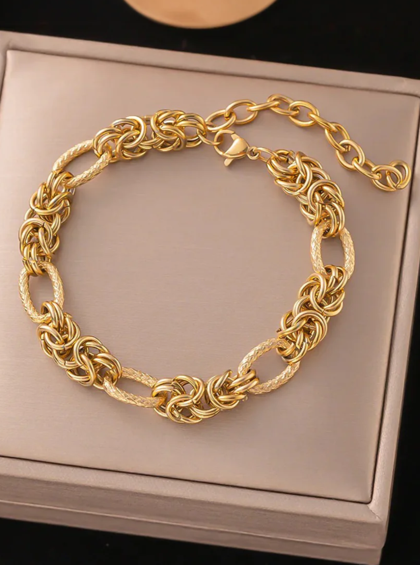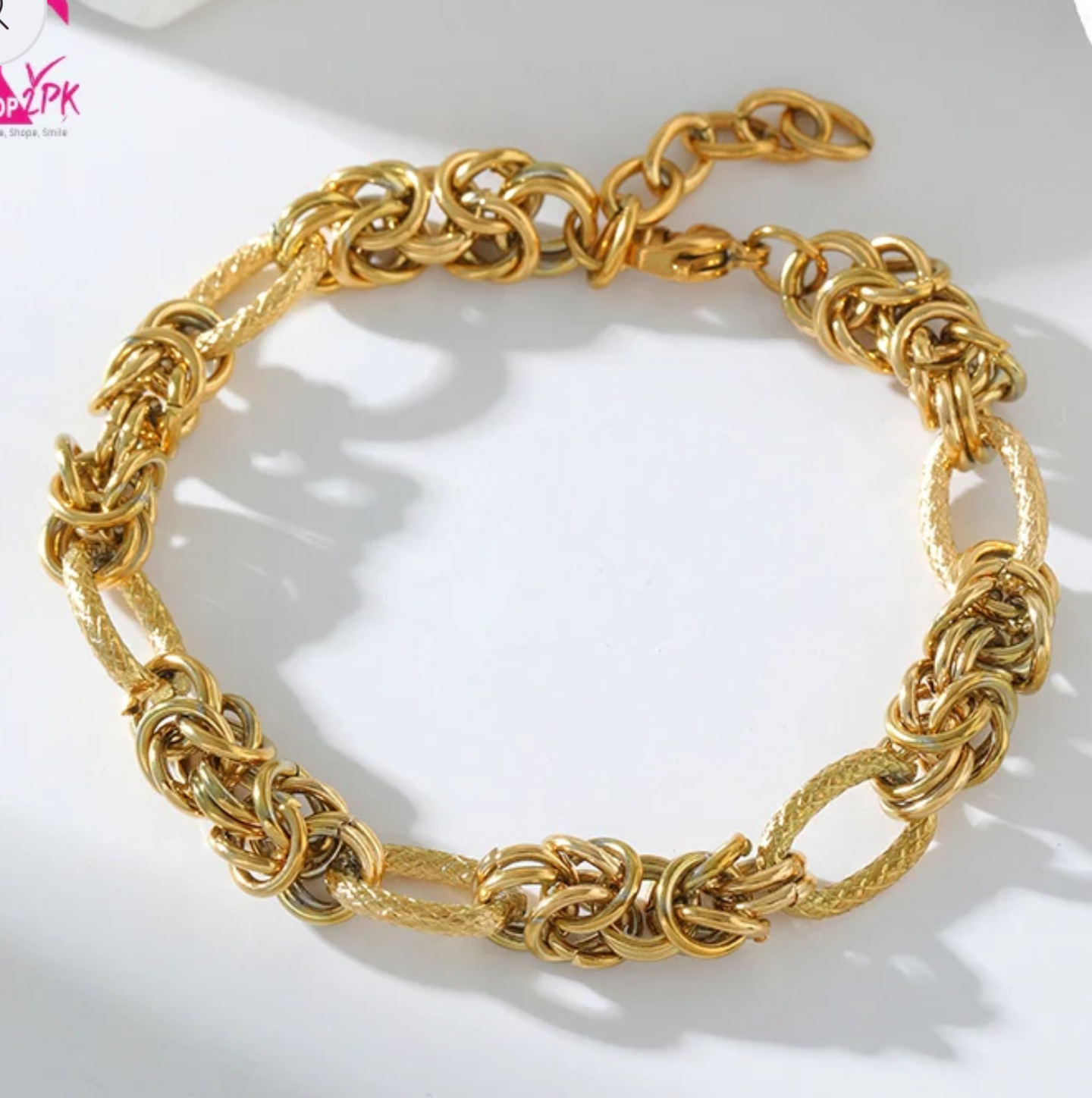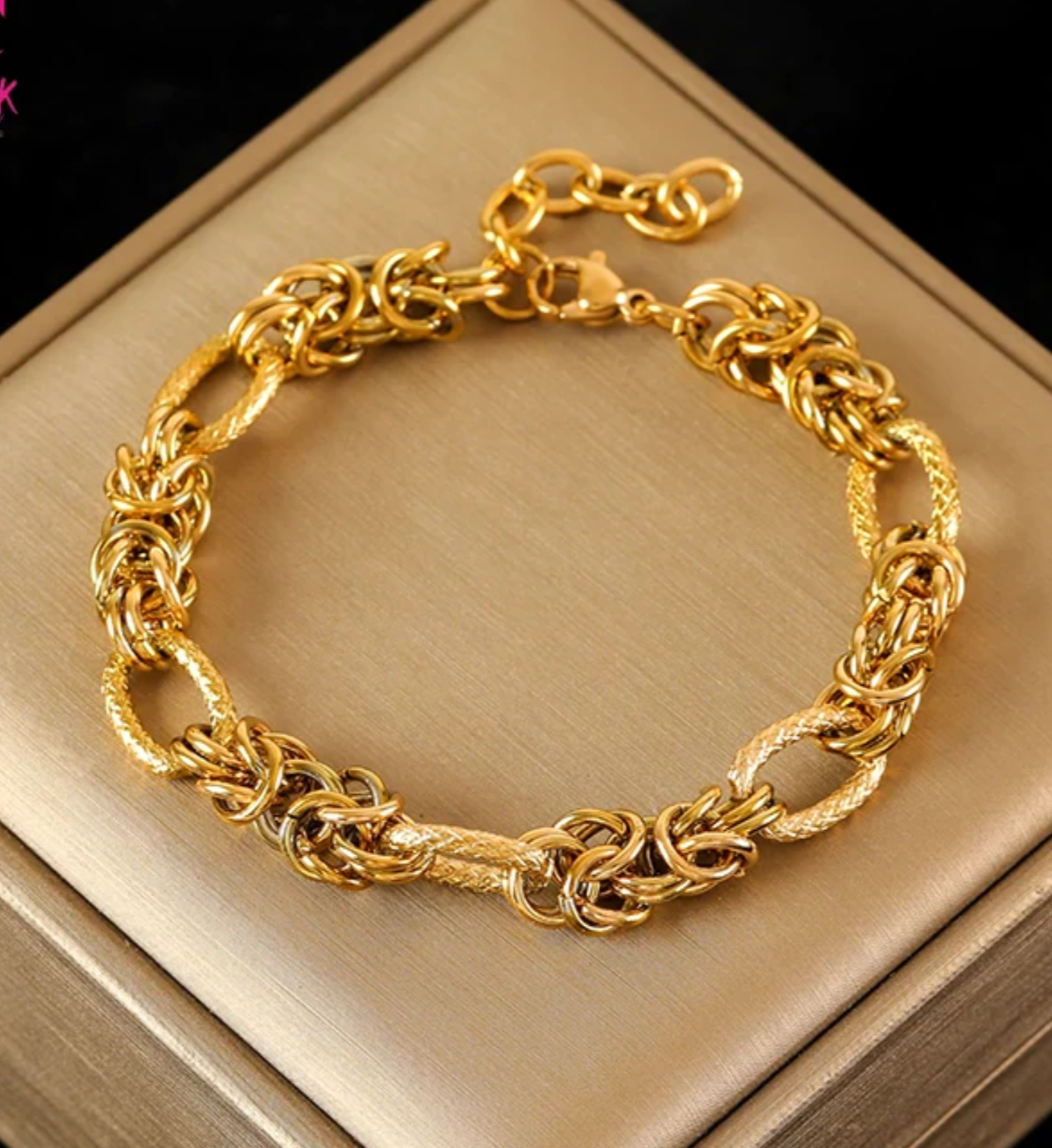 Гривната е изработена от медицинско злато. Топ качество! Гаранция не променя цвета си. Достъпна алтернатива на супер скъпото злато днешни дни ! Регулируема дължина 17-22 см