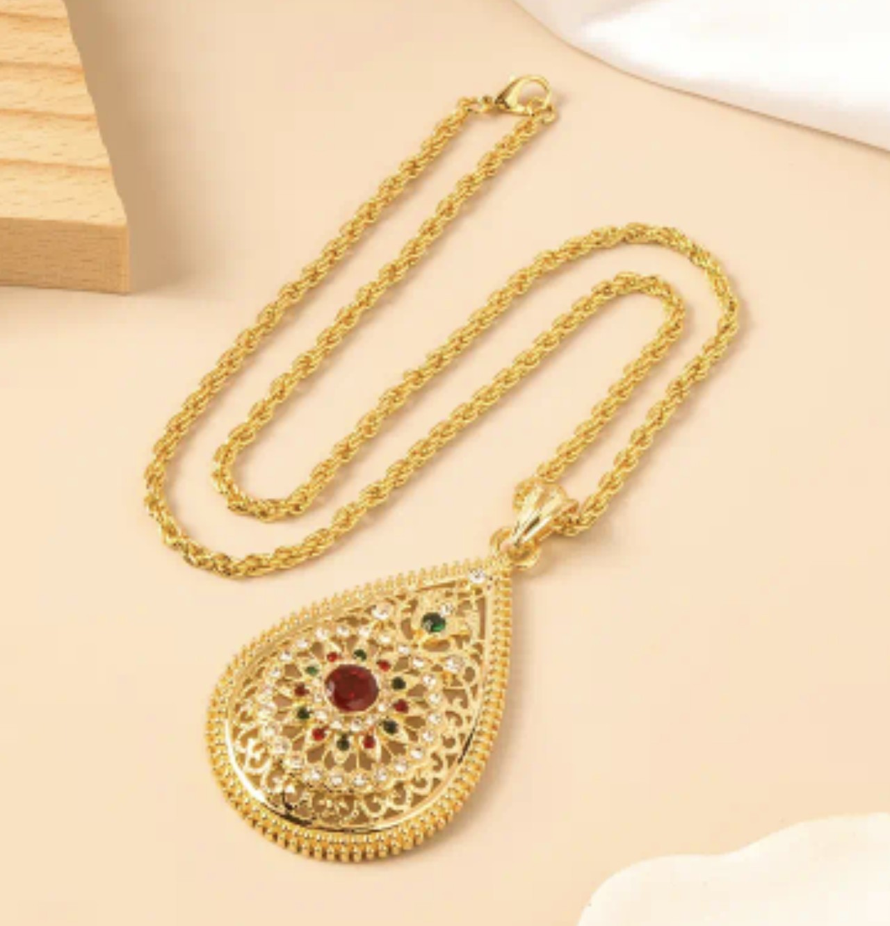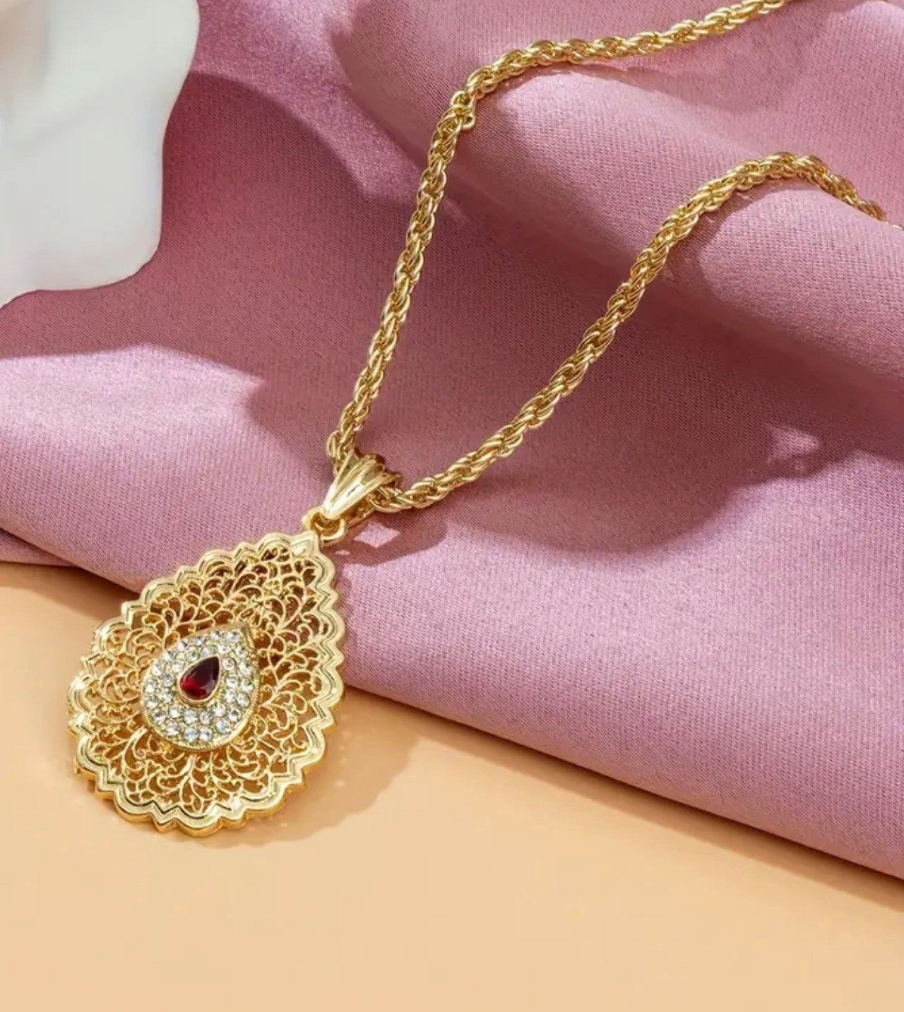Елегантен медальон във формата на сълза, изработен от висококачествено медицинско злато – материал, който не потъмнява, не променя цвета си и запазва блясъка си дълги години. Богато орнаментиран с фини детайли и инкрустиран с блестящи кристали и централен камък в наситено червен цвят, този медальон излъчва лукс, стил и изящество.