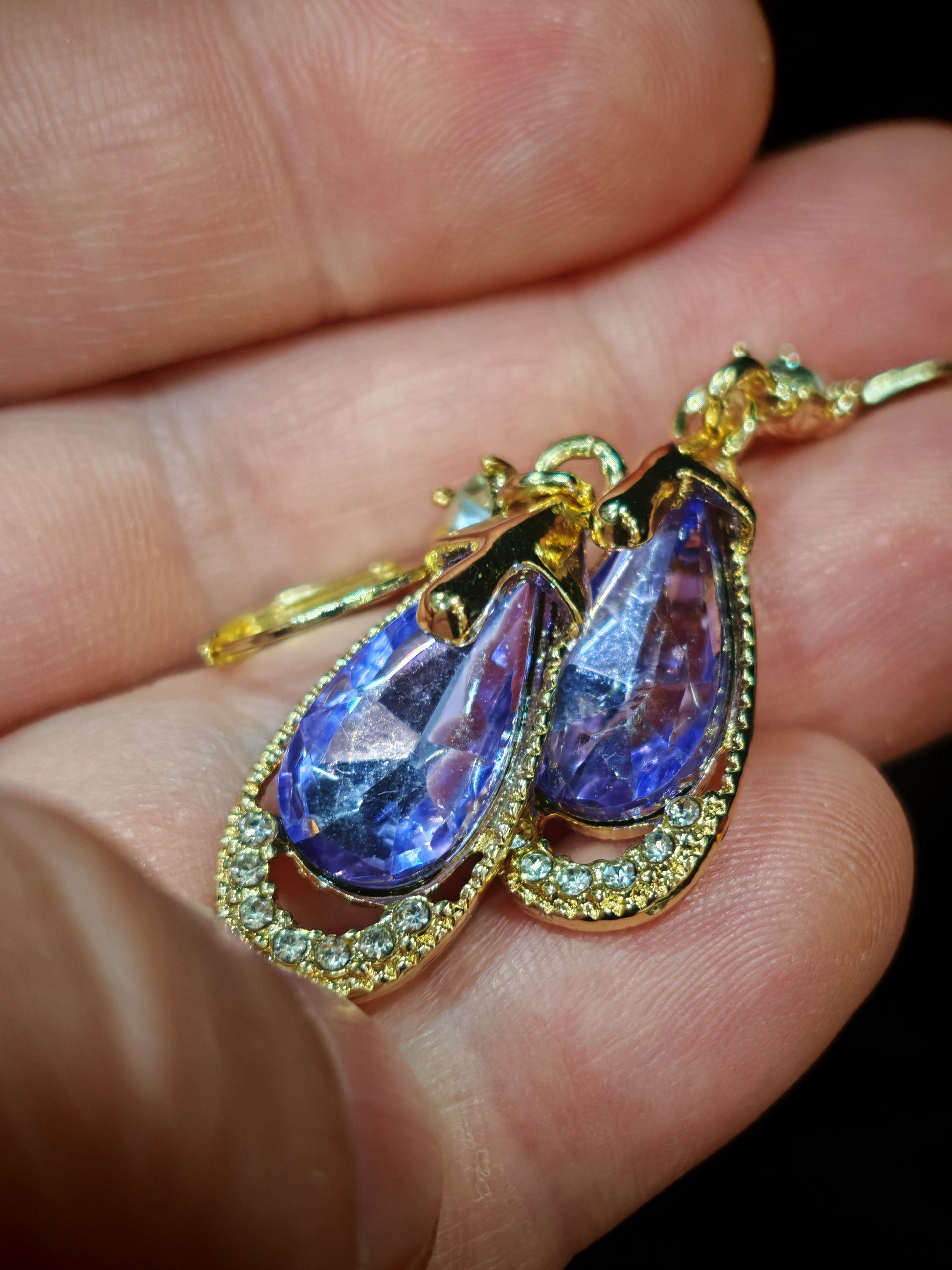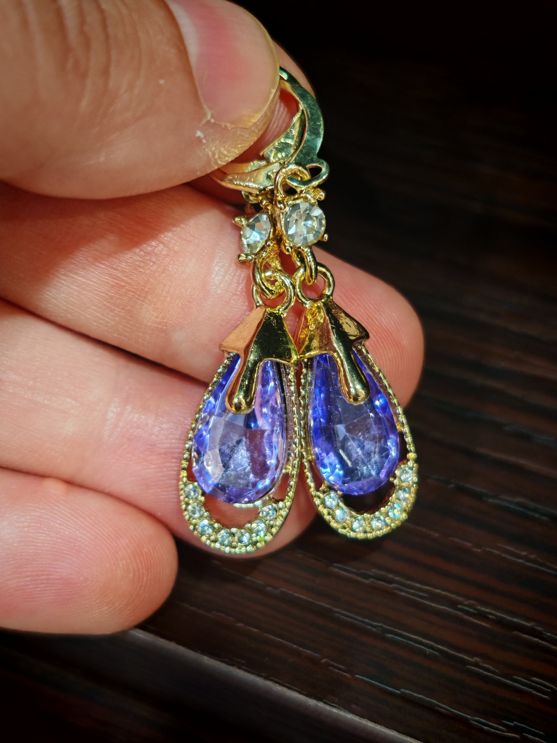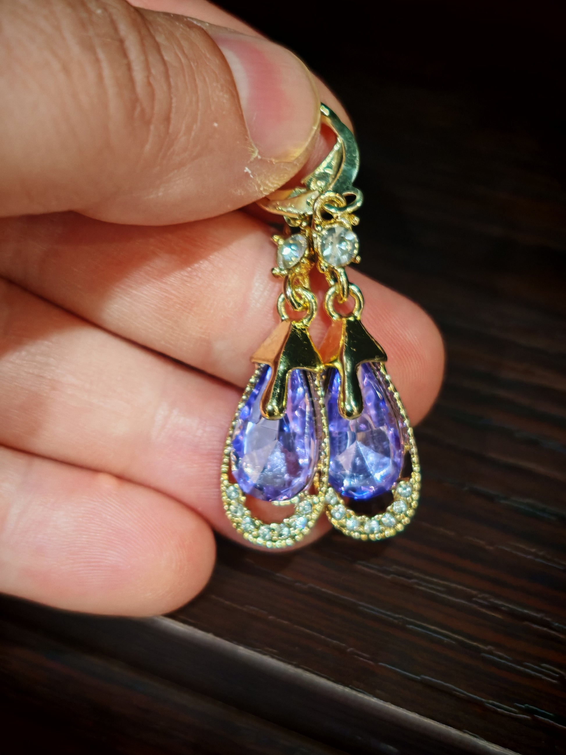 Блестящи и елегантни, тези обеци от медицинско злато 18K покритие впечатляват с големи виолетови кристали във формата на капка, обградени от искрящи циркони. Идеални за вечерни поводи, романтични срещи или подарък, който казва „ти си специална“.