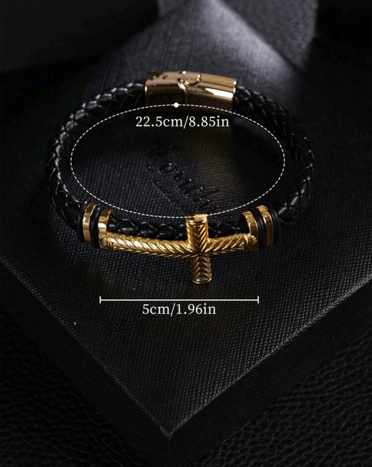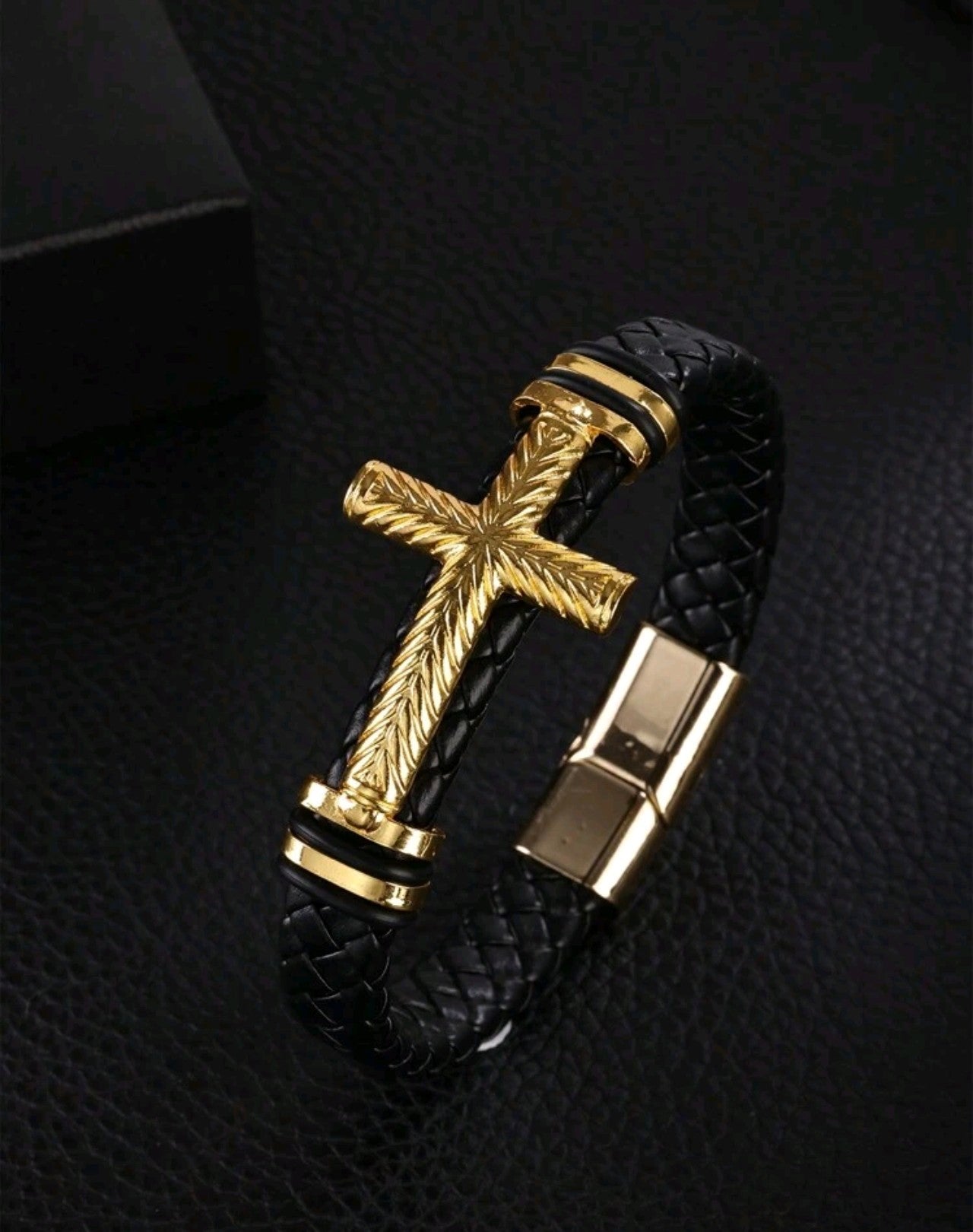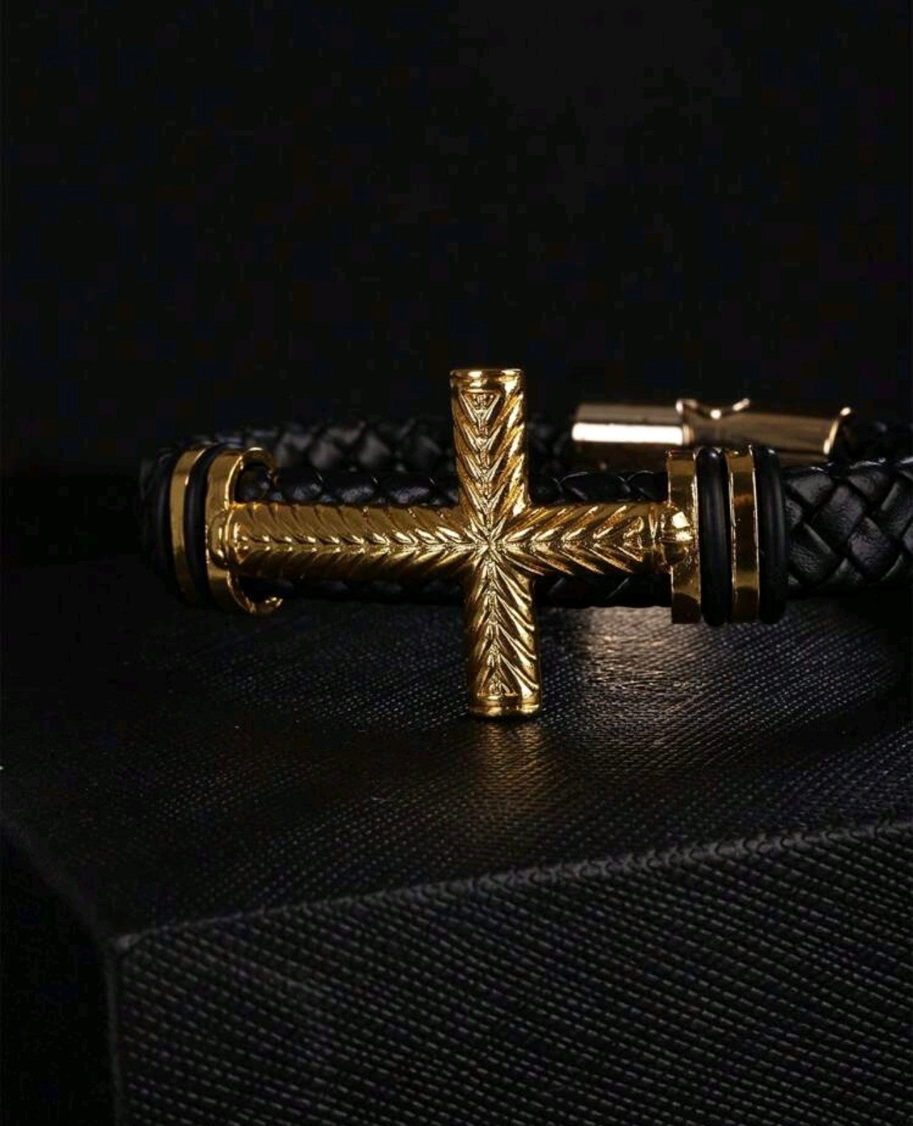 Модерна гривна унисекс с кръстче смесица от кожа и медицинско злато. Обява номер 19