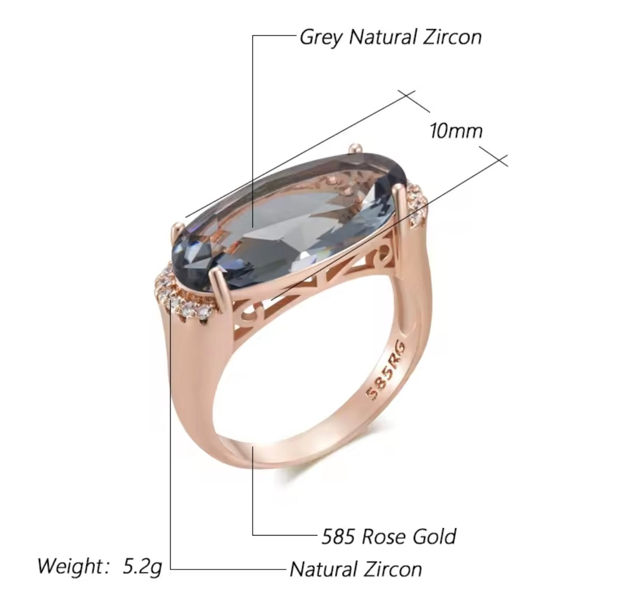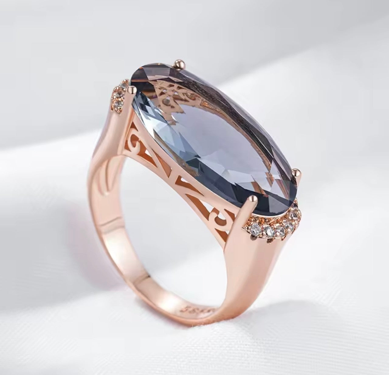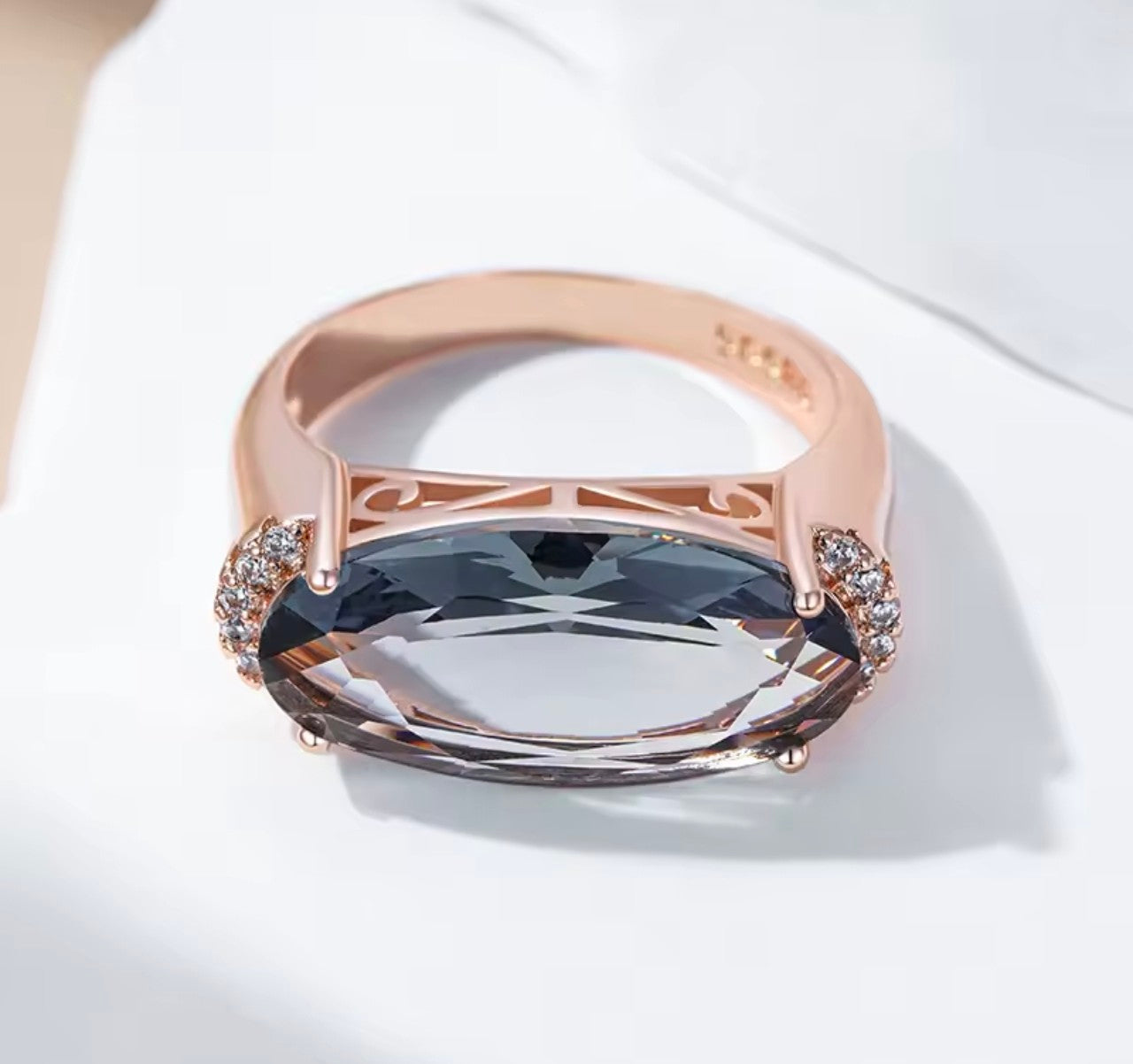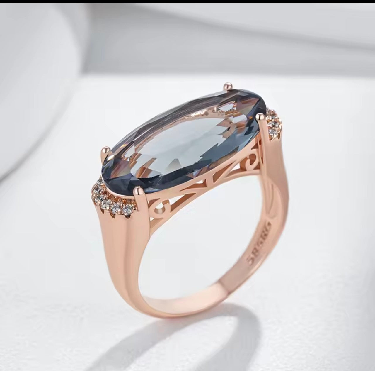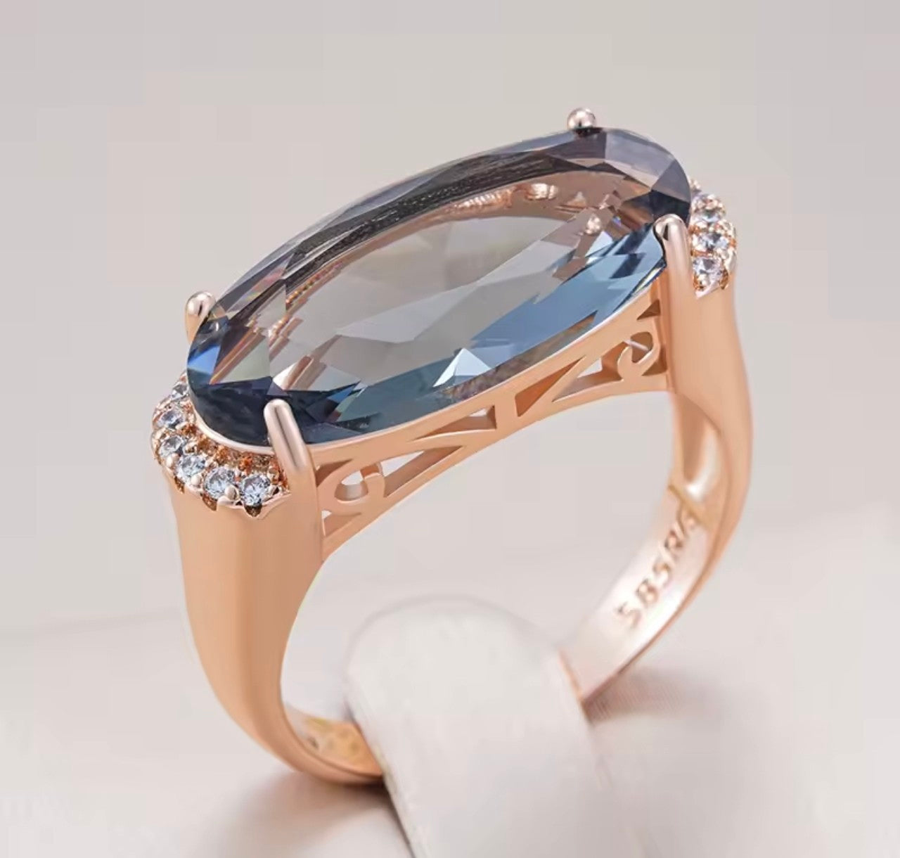 Изящен пръстен, изработен от медицинско злато, което не променя цвета си и запазва блясъка си дори при дълготрайно носене дори има щемпел 585. Основният акцент е впечатляващ централен камък с издължена овална форма и феерични отблясъци в синьо-сивата гама. От двете страни пръстенът е обграден от малки блестящи кристали, които придават завършеност и изисканост на дизайна.