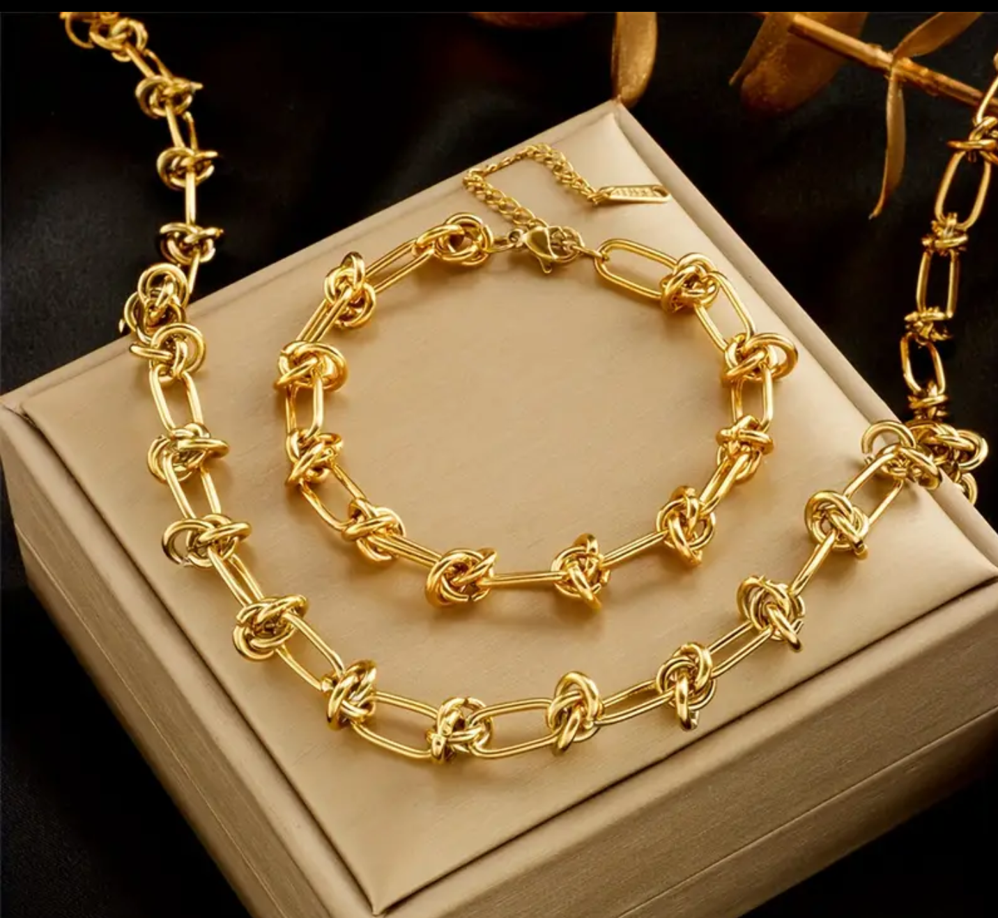 Комплекта е чисто нов внос Италия. Изработен е от висококачествено медицинско злато и не променя цвета си. Страхотна евтина алтернатива на супер скъпото злато днешни дни